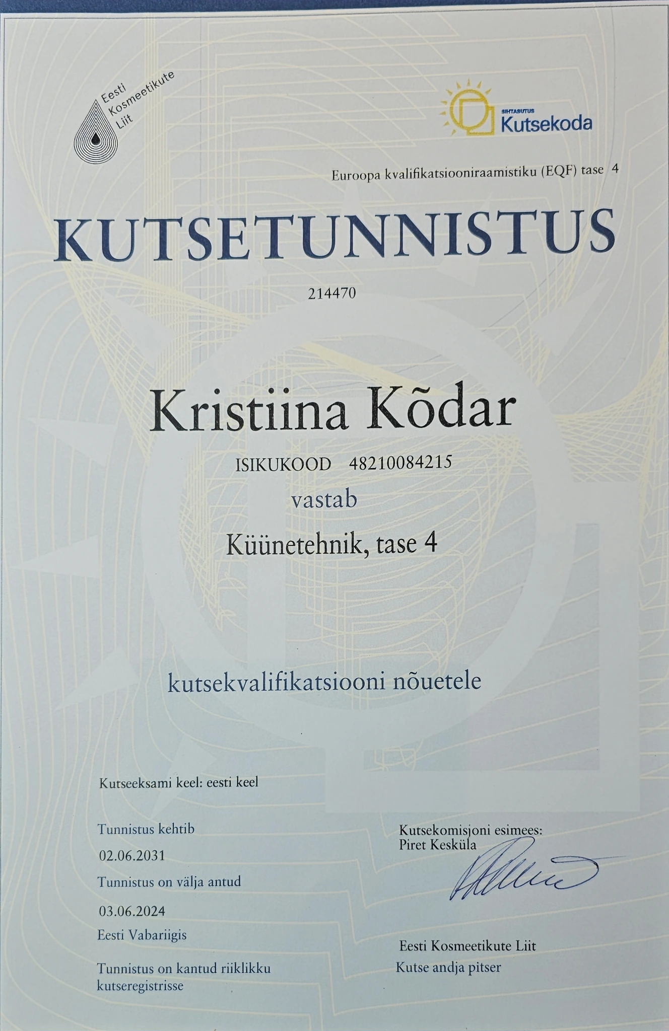 2024, 24.mai - kutsetunnistuse taastõendamine "Küünetehnik, tase 4"